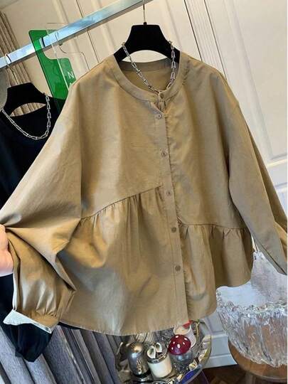 Asymmetric Pleated Patchwork Design Round Neck Button Long Sleeve Blouse - Khaki - View 1