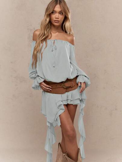 MISSGUIDED Asymmetric Ruffle Long Balloon Sleeves Bardot Mini Dress Cute Sundress - Blue - View 1