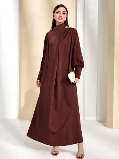Modelyn Asymmetrical Neck Raglan Sleeve Tie Back Dress - Chocolate Brown - View 1