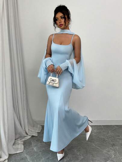 Elenzga 2pcs/Set Figure-Hugging Camisole Dress & Exaggerated Sleeve Top - Blue - View 1