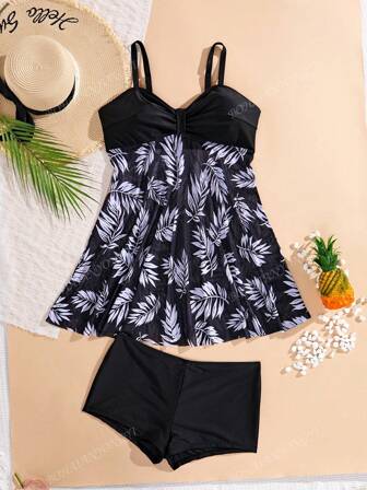 Plus Size Women High Waist Bikini Bottom Swimwear & Sexy Fashion Flower Printed Contrast Mesh Swim Dress, For Summer Beach Vacation