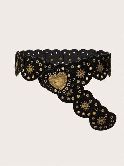 Plus Size XL/XXL Y2K Girl Waist Belt, BOHO Teenager Heart Patchwork Rivet Decor Western Style Retro Waist Belt Accessory, Black Waist Belt, Pair With Skirts, Music Festivals, Parties, Y2K, Plus Size, Valentine's Day - Black - View 1