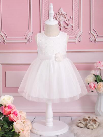 Baby Appliques Floral Front Mesh Hem Dress - White - View 1