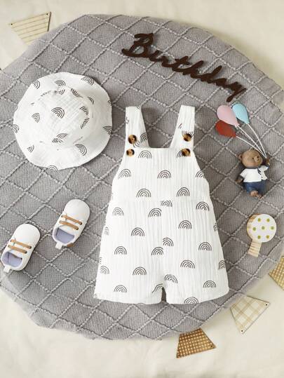 Baby Boy Allover Print Overall Romper & Accessory Hat - White - View 1