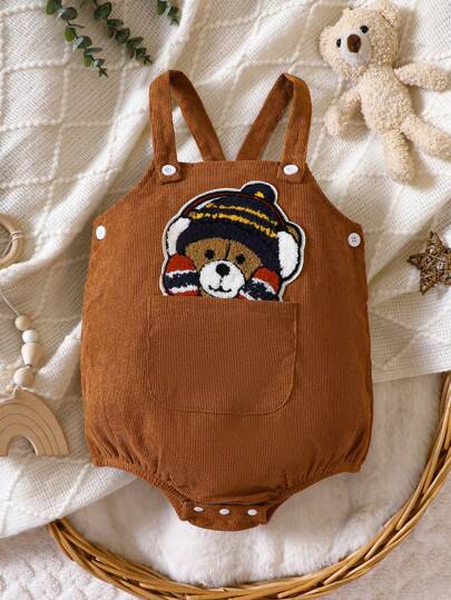 Baby Boy Bear Embroidery Overall Bodysuit - Brown - View 1