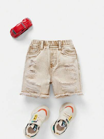 SHEIN Baby Boy Casual Washed Ripped Frayed Loose Straight Leg Khaki Denim Shorts,For Baby Spring/Summer Clothes Spring Break Outfits - Khaki - View 1