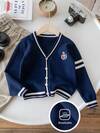 Baby Boys' Knitted Cardigan Sweater, Dark Blue, Front Buttoned, Fashionable And Handsome For Daily Wear, School, Spring, Autumn And Winter