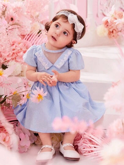 Baby Contrast Lace Puff Sleeve Dress - Baby Blue - View 1