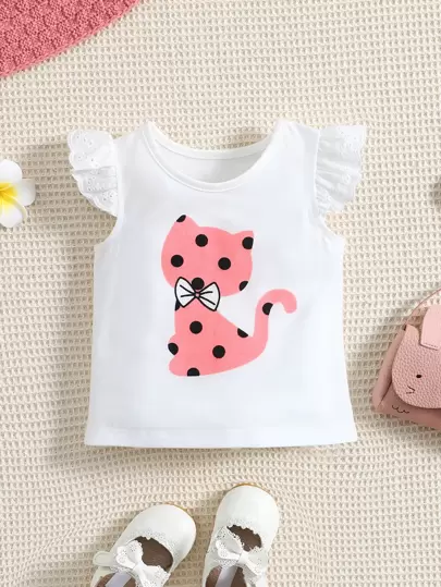 Baby Girl Cartoon Graphic Ruffle Trim Tee - White - View 1
