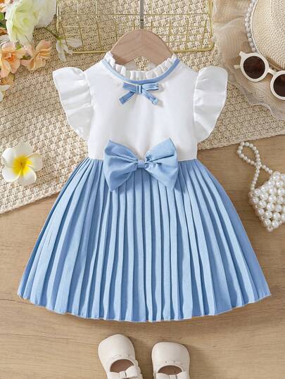 SHEIN Baby Girl Cute Fashion Ruffled Hem Detail Pleated Color-Blocking Dress - Blue and White - View 1