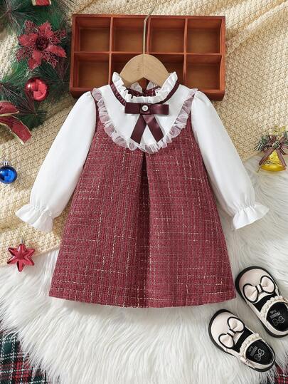 Baby Girl Elegant Frill Mock Neck Bow Front Ruffle Sleeve 2-In-1 Dress - Burgundy - View 1
