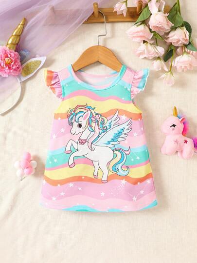 Baby Girl Unicorn Print Ruffle Trim Dress - Multicolor - View 1