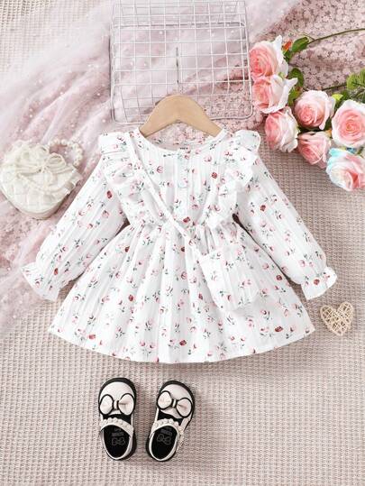 Baby Girl Floral Printed Bell Sleeve Dress - Multicolor - View 1