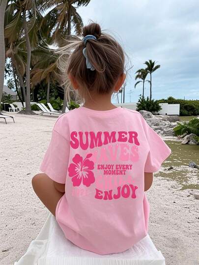 Baby Girls' Simple Flower & Letter Print Round Neck Short Sleeve Cute Top - Pink - View 1