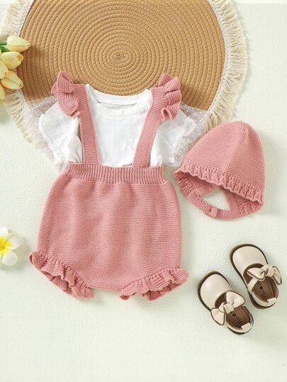Baby Ruffle Trim Knit Pinafore Shorts & Accessory Hat Without Tee - Dusty Pink - View 1