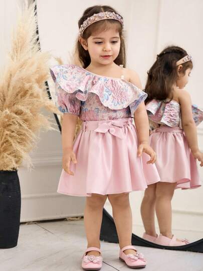 SHEIN Babygirl Cute Summer Floral Pattern Ruffle Top And Mini Skirt Set - Pink - View 1