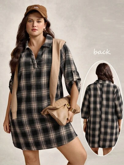 Zelara Plus Size Casual Minimalist Style Everyday Dress Spring Break Boho/Bohemian,Holiday Outfits,Resort Dresses, Outdoor Essential For Daily Wear Sundress Casual Plaid Dress Women Casual Daily Wear, Commute Elegant Office Outfits For Women Fall Clothes For Women Going Out Tops For Women Brown Dress - Multicolor - View 1