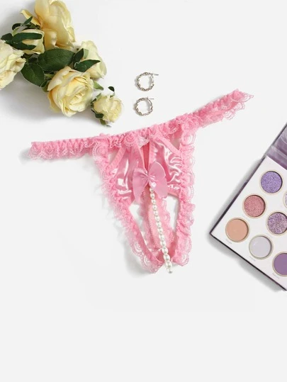 Classic Sexy Beaded Contrast Lace Crotchless Panty - Pink - View 1