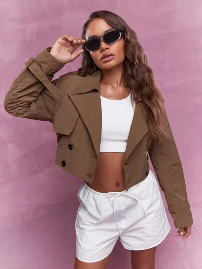 MISSGUIDED Belt Detailed Crop Trench Coat - Brown - View 1