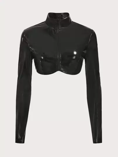 SHEIN ICON Bikercore Zip Up PU Leather Crop Top - Black - View 1