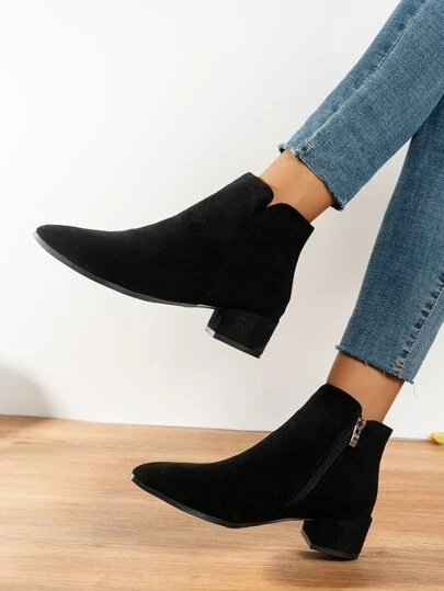 Black Elegant Solid Color American Style Short Boots With Side Zipper, Faux Suede & Block Heels - Black - View 1