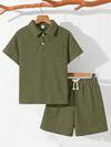 SHEIN 2pcs Tween Boy Casual Loose Solid Color Polo Collar Short Sleeve T-Shirt And Shorts Set, Suitable For Commuting, School, Daily Casual Wear, Sports, Spring/Summer