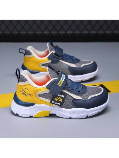 Boys' Fashion Color Blocking Hook And Loop Athletic Shoes - Shock-Absorption, Slip-Resistant, Breathable Mesh Sport Shoe, Suitable For Outdoor Running And Walking - Yellow - View 1