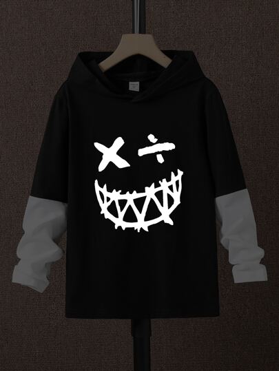 Boys Reflective Cartoon Graphic 2 In 1 Hooded Tee - Black and White - View 1