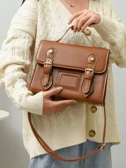 LECEY Buckle Decor Flap Square Bag - Brown - View 1