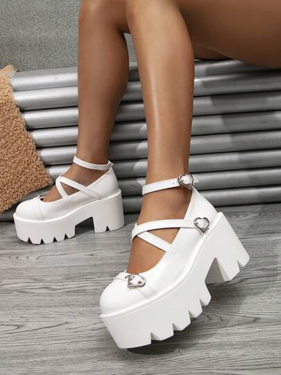 Buckle Detail Wedge Mary Jane Shoes - White - View 1