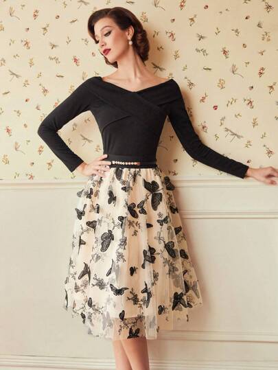 SHEIN DECDS Butterfly Appliques Mesh Overlay Skirt - Apricot - View 1