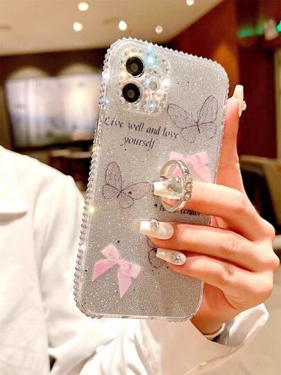 Apple Butterfly Print Glitter Phone Case With Ring Holder Compatible With IPhone15/15Plus/15Pro/15Promax Waterproof Shockproof Anti-Fall Scratch Resistant - Multicolor - View 1