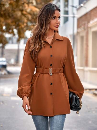 Button Front Drop Shoulder Belted Shirt - Brown - View 1