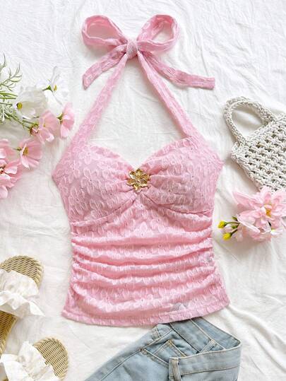Soleia Women Vacation Floral Textured Knitted V-Neck Floral Metal Button Fitted Cami, Casual Wear For Dating, Afternoon Tea, Beach, Cruise, City Trip, Music Festival, Party, Boho Baby Pink Top Pink Lace Top,Can Be Worn Inside Or Outside Pink Beach Top - Baby Pink - View 1