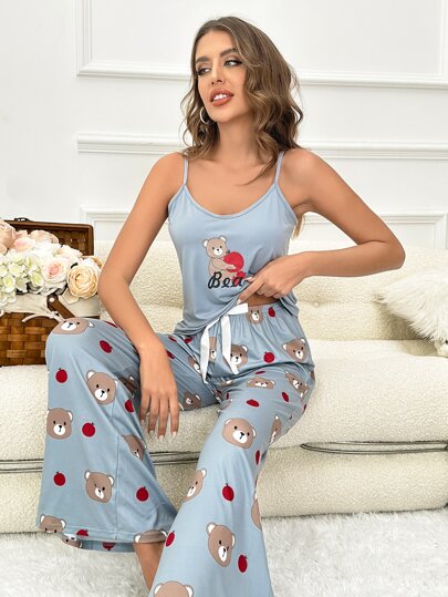 Cartoon Graphic Cami Top & Bow Front Trousers PJ Set - Blue - View 1