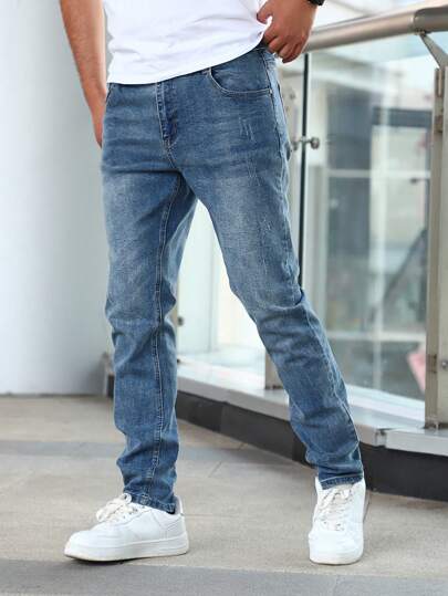 Casual Fashion Versatile Daily Slim Fit Simple Button Men Jeans - Blue - View 1