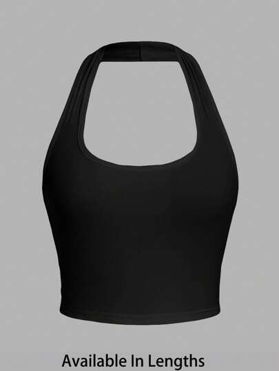 SHEIN Tall CURVE Casual Minimalist Solid Color Cropped Halter Neck Fitted Tank Top For Plus Size Women, Suitable For Summer - Black - View 1
