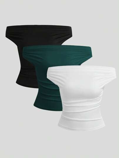Sweetra Casual Minimalist Solid Color Ruched Off Shoulder Slim Fit Top - Multicolor - View 1