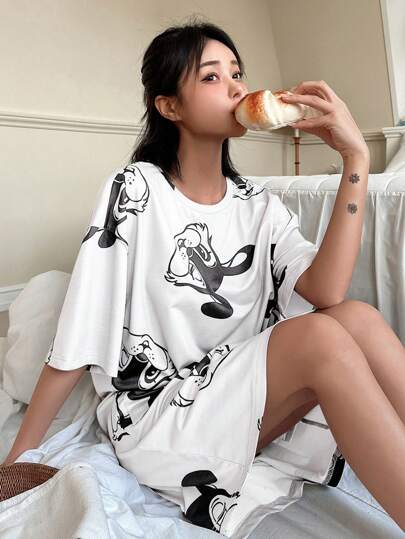 DAZY Casual Summer Rabbit Printed Loose Short Sleeve Sleep Dress, Moo Moo Pajama - White - View 1