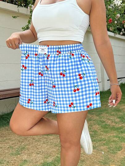 SHEIN EZwear Cherry Plaid Casual Summer Holiday Plus Size Shorts - Multicolor - View 1