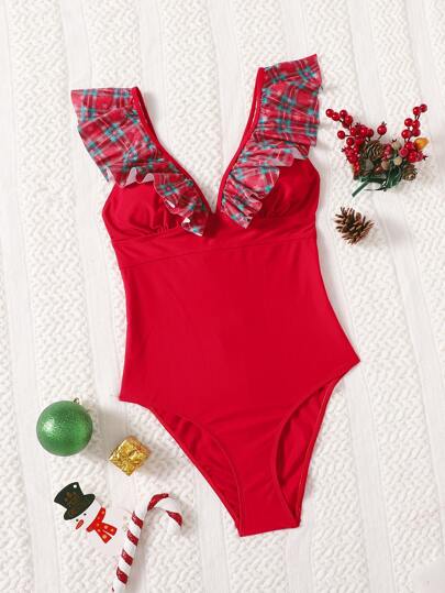 Christmas Ruffle Trim One Piece Swimsuit - Red - View 1