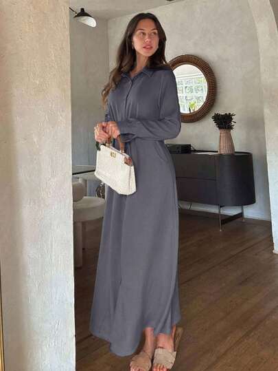 Cloudara Casual Style, Linen Look, Self Belted Maxi Shirt Dress, Suitable For Modest Long Casual Dress Long Sleeve Elegant Dress Gray Long Dress Long Shirt Dress Curve Long Dress Homecoming Old Money Style Women Autumn Clothes - Dark Grey - View 1
