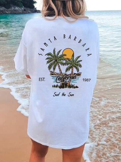 INAWLY Coconut Tree And Letter Print Drop Shoulder Short Sleeve T-Shirt SANTA BARBARA EST 1987  Surf The Sun - White - View 1