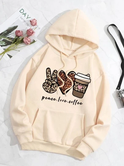 SHEIN LUNE Coffee And Letter Graphic Drawstring Thermal Lined Hoodie - Apricot - View 1