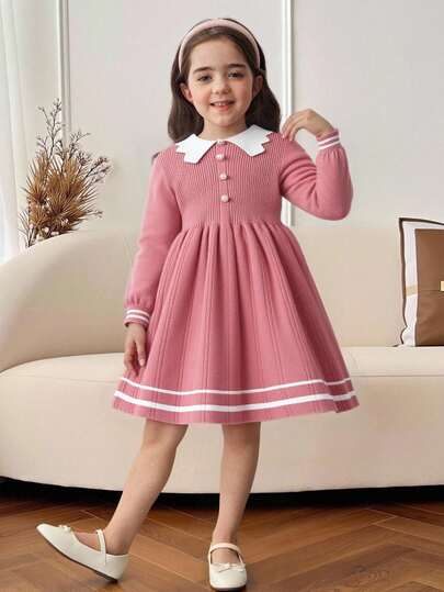 SHEIN Leap Crew Contrast Color Collar Form-Fitting Casual Sweater Dress For Young Girls,In Fall/Winter - Pink - View 1