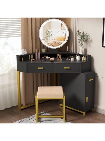 PAKASEPT Corner Vanity Set With Lighted Mirror, Makeup Dressing Table With Drawers, Cabinet And Cushioned Stool, Girls Vanity Desk For Bathroom, Bedroom,White - Black - View 7