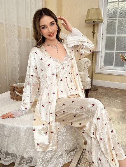 CottageSlumber 3pcs/Set Plush Cherry Print Lace Patchwork Camisole Top & Pants And Robe Loungewear Set, Autumn/Winter Holiday Season - Apricot - View 1