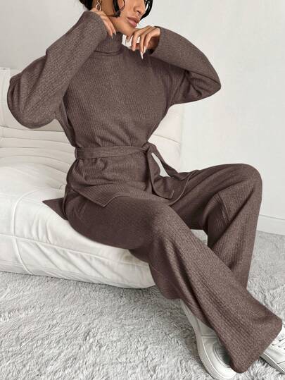 EURMUSE Solid Color High Neck Leisure Knitted Sweater 2pcs/set - Brown - View 3