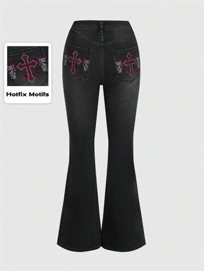ROMWE Grunge Punk Cross Rhinestone Flare Leg Jeans - Black - View 1