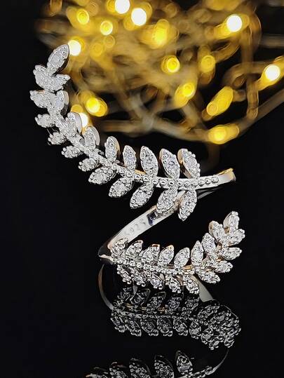 Cubic Zirconia Leaf Decor Cuff Ring - Silver - View 1